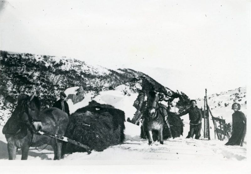 Høykjøyring frå Reiakvamstølen. Frå venstre Ola Lundevang, Magne Reiakvam (Bjørke) og Bjørg Reiakvam ( gift Solhheim). Foto: Dagfinn Reiakvam