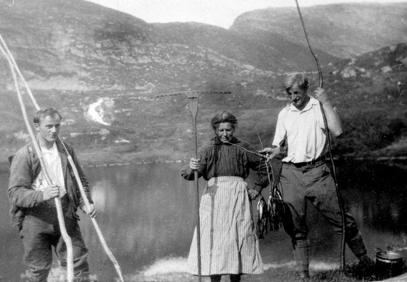 Rise Fimland, ”Rise i Jæra” stølte i Gotdalen i mest 40 år. Her har ho besøk av to fiskarar, Ingolv Eimhjellen t.v. og Jostein Eimhjellen t.h. kr. 1930. I bakgrunn Fimlandskvia og Langevassegga. Foto: Joar Eimhjellen