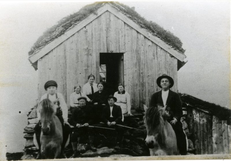 Frå venstre på trappa: Elisabeth Fjellestd Solheim f. 1901, Sara solheim f. 1893 – d. 1928, Jenny Solheim f. 1899 -d. 1974 og Steffina Solheim f. 1895 – d. 1914. Sittande på trappa foran: Karl Fjellestad f. 1893 – d. 198 0og Asbjørn Solheim f. 1897 – d. 1960. Til hest til venstre Ingolv Solheim f. 1903 – d. 1970. På hest til høgre: ukjend
