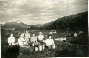Budeier ved Reiakvamstølen frå venstre: Bjørg Reiakvam gift Solheim, to ukjende, Ranfrid Hunskår gift Strømsnes, Målfrid Lundvang og Aslaug Reiakvam.