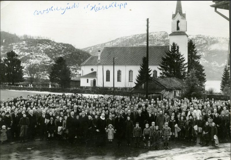 Avskjedsgudsteneste for prost Huseklepp, menigheten samla utanfor kyrkja. Postkort